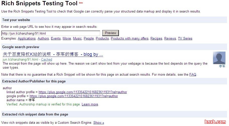 目前显示为Rich Snippets Testing Tool Beta,也就是测试版,下面是我添加代码后检测的截图,新上传的头像未能更新显示。