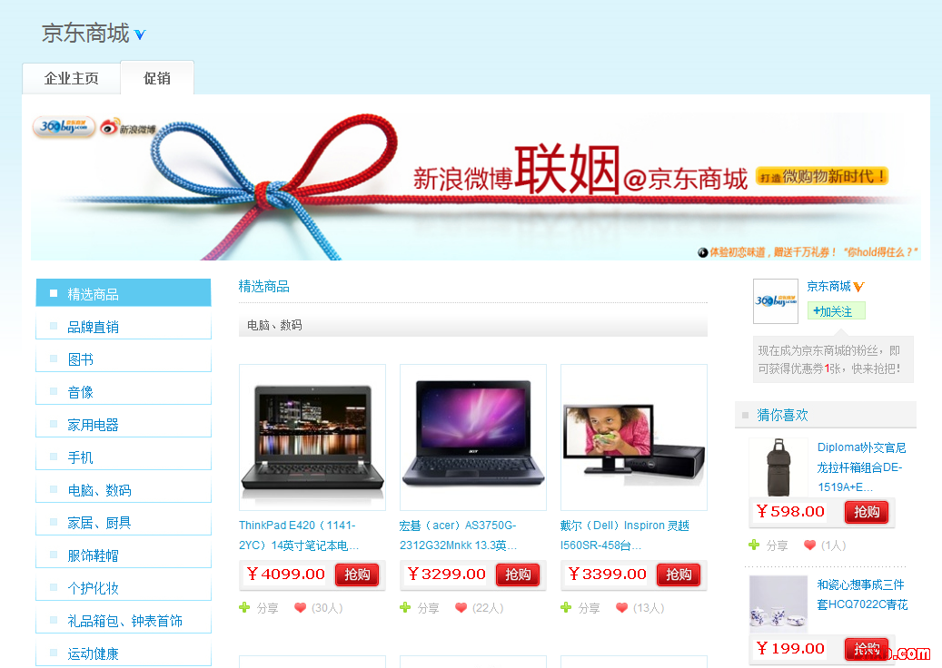 2、今天晚上看到京东微博已经发生变化,微博主页出现“促销”导航,点击进去出现商品导航和展示。我立马打电话联系京东的朋友,确认这是新浪专门为其定制的。