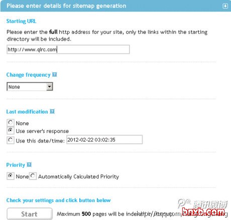 这是一个很小的工具,同时他也是被谷歌所推荐的网站地图生成工具。这个工具的地址是:http://www.xml-sitemaps.com/,如下图所示,当我们进入这个工具后,我们可以根据上面提供的选项来选择适合自己站点的网站地图。生成网站地图后,我们只要把这个文件放在网站的根目录上就可以了。