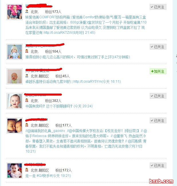 近期在管理@拉夫尔有机生活 ,(拉夫尔-专注于孕婴幼儿的有机生活),下图是通过一个粉丝所关注的好友,可以发现很多头像都是婴儿,这些都是潜在目标!