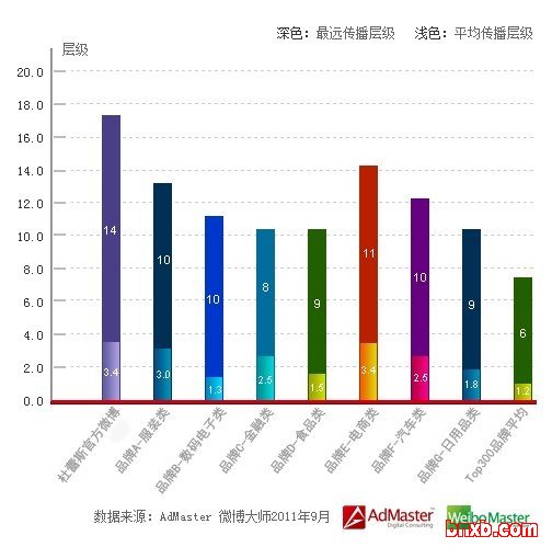 最后,我们再引入一个互联网广告中常用到的评估指标“曝光数”来看看@杜蕾斯官方微博 的营销价值所在。通过WeiboMaster微博大师,我们可以计算出任意一条微博的曝光数,并追踪到该微博的转发路径和层级。以著名的“杜蕾斯鞋套事件”为例,该条微博在发出的一小时内就获得了29,536次转发,第二小时获得17,247次转发,前六小时共获得81,611次转发,累计获得惊人的62,138,520次曝光。如果微博上每CPM按照10RMB算的话,那这条微博就为杜蕾斯带来了62万元的曝光价值。同时,通过对微博传播路径的分析,该条微博最远转发层级达到14层,并被粉丝超过10万的60个意见领袖转发/评论。此外,我们再对比一下9月份杜蕾斯所有微博的平均转发层级和Top300品牌微博的平均转发层级(图-3)。@杜蕾斯官方微博的平均转发层级为4.25,而Top300品牌只有1.98,是平均水平的2.15倍。