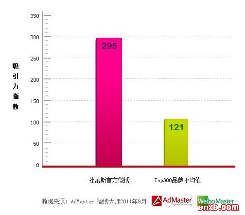 其次,让我们对比分析一下@杜蕾斯官方微博与其它品牌微博在内容质量上的差距。对于微博运营者而言,微博营销最核心的竞争其实就是内容之争。因而,对于微博内容质量的评估不可或缺。通过对每一条微博传播路径的追踪,WeiboMaster微博大师可以随时计算任意时间段所有微博的转发总数和评论总数。我们由此设置了内容吸引力指数,即平均每条微博获取的互动数(包括评论数和转发数)。以2011年9月份为例(图-2),@杜蕾斯官方微博的吸引力指数达到295,而Top300品牌微博的平均指数只有121,是平均水平的2.4倍。由此可见,内容为王的理念在微博营销上体现的更为突出。