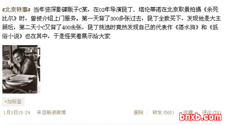 在内容的把控上,由于话剧本身是一部现代剧,所以追忆往日的北京只是其中一个部分,展示当下北京尤为重要,其中发布的一条关于知名鬼才导演昆丁·塔伦蒂诺在北京拍摄《杀死比尔1》期间买盗版盘的故事,引起了大家的兴趣。