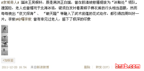 对于传奇人物和历史事件,文案的叙述都不是百度百科式的平铺值叙,而是通过特定的角度或故事的进行剖析,在12月中旬,粉丝只有300人左右的情况下,一条“溜冰王”吴桐轩老人的内容被转发300余次,而之后微博出现对老人的介绍,基本都有转述这条。