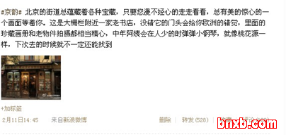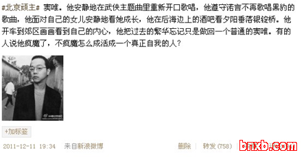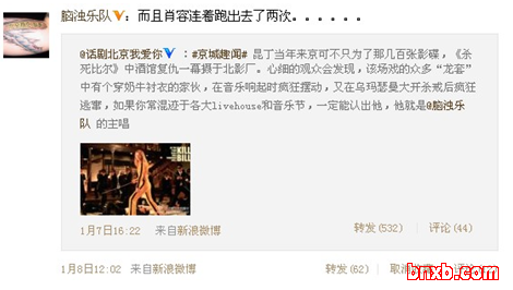 其中草根大号@乐活北京 和@北京全攻略 也相继转发了话剧这边的内容,其中以一条评价窦唯的内容效果最佳,由于大号采取原发加注明出处的方式,故原微博不做累计。这条本被转发758次的内容,在@乐活北京 一处发布就被转发100余次。这中方式也是运营人员与这些草根号进行沟通的结果,所以善用草根大号并叫它们乐意发布时候注明内容来源也是内容营销的胜利。