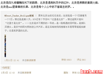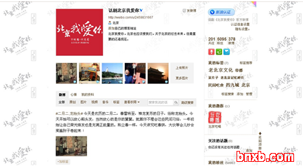 为了更广的接受度,日常的微博语调不是纯正的京腔,但对北京的品味绝对纯正。微博内容模块的建立上,大致分为奇闻异事、民间吃食、往日北京风情和京城相关人物为主线,并以各个系列展现例如#北京顽主# 、#帝都美食#、#爱北京的99个理由# 其中#京城奇人#系列关注度最高,甚至有不少每天等直播的粉丝。