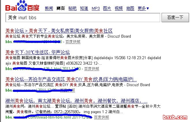 通过一些高级指令能让我们快速找到一些高权重的网站,如inurl: 这个指令就给我们帮上大忙了,百度、google都支持该指令,我们可以通过:关键词+inurl: +我们想要的类型,如bbs、gov等等。比如我想搜索有美食的论坛的话,我们就可以用:美食 inurl: bbs 这个时候就会返回一个在标题中含有美食的论坛,如下图所示: