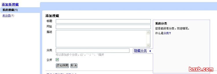 2、点击“添加新搜藏”链接,在“添加搜藏”栏中填写标题、网址、描述、分类信息。在这里我们填写自己网站的对应信息。确保“公开”选项处于选中状态,这样在非登陆状态下别人也能够看到我们的收藏信息。