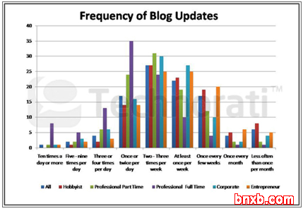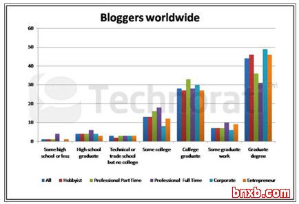 请注意Technorati上的数据偏重业余博主,即那些仅把博客作为娱乐工具而非盈利性目的的群体,而我侧重关注另外40%的群体,即有商业目的博主。