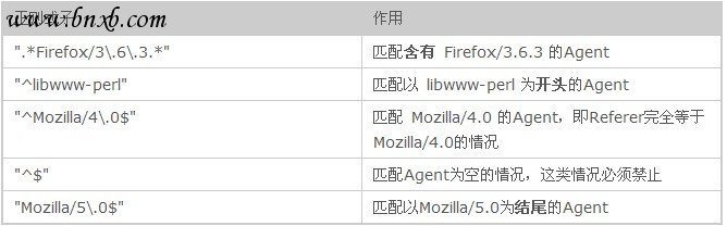 以上只是个例子,切不可用于你的网站,否则使用Firefox 3.6.3的用户就不可以访问你的网站了,访问结果Http Code都是403,他们看到都是403页面,也就是禁止访问页面。这里让我来教你如何编写封杀的规则,以上语句SetEnvIfNoCase User-Agent ".*Firefox/3\.6\.3.*" bad_agent指定了要封杀的规则,核心语句 ".*Firefox/3\.6\.3.*" 用于匹配含有 Firefox/3.6.3 的来源,写法见正则表达式的写法,这里给出几个正则例子,你可以套用: