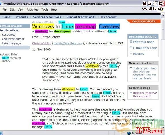 我将以 developerWorks Windows to Linux Roadmap 概述页面(www.ibm.com/developerworks/linux/library/l-roadmap.html)为例。这个路线图用来帮助那些希望从 Windows 迁移到 Linux 的开发人员,概述页面针对开发人员可能搜索的单词做了广泛的优化。我突出显示了在顶部标记和前 200 个单词中出现的关键词。