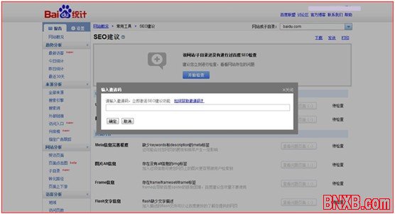 2、激活邀请码方法:安装好百度统计后,在【报告】页面点击左侧导航里的【SEO建议】,进入报告后点击“开始检查”按键,在弹出的文本框中输入邀请码即可激活该功能。