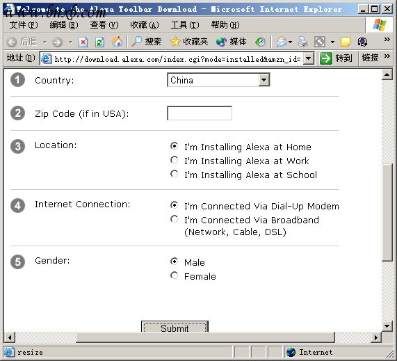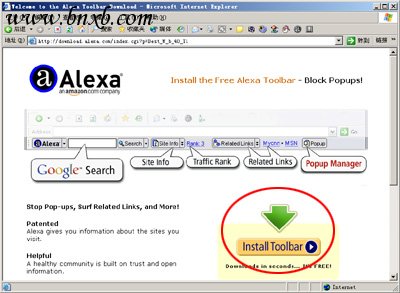 7、完成安装之后您的浏览器会多一个AlexaToolbar工具条,这样当你访问任何网络的时候都可以查看该网络当前的全球排名,另外该工具条还可以阻止各种弹出广告(需要提醒的是,在访问GBQ的时候有两个地方会遇到弹出窗口,第一个是首页会有一个“拉人计划”的广告,大家如果已经了解这个活动就可以选择阻止弹出;另外一个是在您登录GB后会弹出GBQ窗口,此时请务必选择允许弹出,不然就不能使用GBQ聊天了)