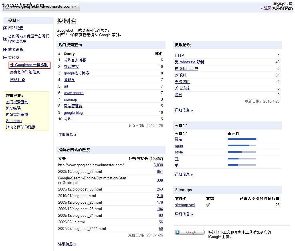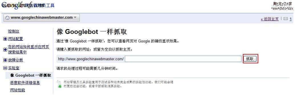 首先,登入网站站长工具中,“像Googlebot一样抓取”功能就会出现在实验室版块的导航菜单的最下方: