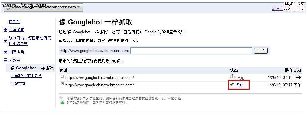 点击“抓取”,然后等待几秒钟。刷新网页后,就能看到请求抓取的状态。如果成功,他可以点击“成功”链接。