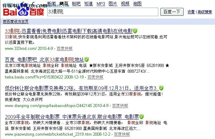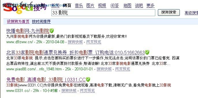 GG现在已经越来越不行了,有很多站长反应就连GG的广告都不怎么好了,收入一天比一天低。现在GG离开了,回头来看看我们国内的各大搜索引擎,下面以笔者搜索自己的站 “33影院"为例,需要说明的是,这个是站是4月1号上线的,今天才被百度放出10几页。我们来看看各家的搜索结果。