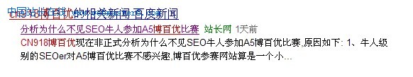 百度前几条数据都不是CN918博百优(www.cn918.cn)网站数据,这可能跟百度收录有关系。CN918博百优首页有“CN918博百优”信息,百度没有辨别出来,可能跟CN918博百优自身权重小有关系,但是百度对于原创辨别能力还存在不足。