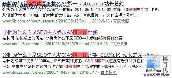 再仔细看看百度前几条数据的标题。您发现什么现象了吗?前面几条数据中标题没有出现“CN918博百优”关键字,只有“博百优”这个词被标红了。这说明百度在切词上偏向“博百优”这个词。建议做百度优化博百优SEO,考虑下百度切词分词技术。