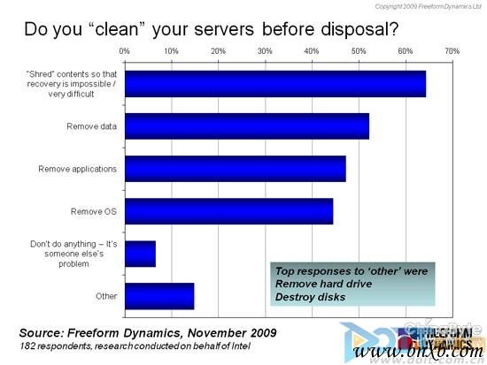 一些最有趣的发现是关于对旧设备的处理上。1/3的机构认为应当对旧设备进行合理的内部利用。20%的受访者认为对于旧设备的处理应当取决于环境;只有10%的机构指出了明确的对于旧设备的处理方法。处理旧设备被证明在许多机构是"最后想到的事情",相比之下对于数据的重视就显得格外突出。超过60%的受访者选择了"切碎"服务器里的内容,转移数据、应用程序和操作系统也都是常用的手段。