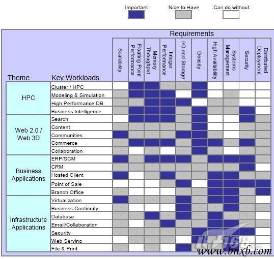 最近在查阅IBM服务器产品指南白皮书时,发现在其每份白皮书后都有这样一张表,用一种简单明了的方式告诉你怎么选型。纵向列出了几大主要应用的负载类型,如HPC、Web2.0\Web3D、业务应用、基础架构等,横向列出了这些应用负载对于服务器系统的不同要求,包括可扩展性、浮点计算性能、内存吞吐、整数计算性能、I/O和存储、密度、高可用性、系统管理、安全、分布式部署等。如下图所示,蓝色框表示该考量指标对该应用负载来说“非常重要”,灰色表示“有则更好”,白色表示“没有也行”。
