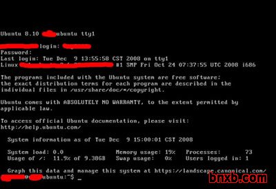 重启完了之后会自动进入命令行模式,因为ubuntu server版本没有GUI,所以,所有的工作只能在命令行模式下进行了,当然,你如果对命令行一壳不通,那你也可以弄个GUI上去。不过,很是麻烦的,我也试了,最后还没放弃了。装完重启之后会进入命令行界面。