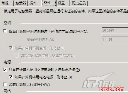 在“条件”标签页面中,我们可以指定用于与触发器一起判断是否应运行该任务的条件,要是在这里设置的条件不是真,那么目标触发任务将不会被自动执行。例如,我们可以设置在本地计算机处于空闲状态多长时间后就能自动运行当前触发任务,也可以设置只有本地计算机在使用交流电源时才启动运行当前触发任务,甚至还能设置在指定网络连接有效时才能启动运行目标触发任务(如图3所示)。