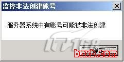 日后,一旦服务器系统中有人偷偷创建用户账号时,服务器系统屏幕上将会自动出现如图4所示的报警提示信息,看到这样的提示信息,网络管理员就知道有非法用户在服务器系统中偷偷创建用户账号了,此时网络管理员应该及时将新创建的陌生账号删除掉,以防止陌生账号给服务器的稳定运行带来安全威胁。