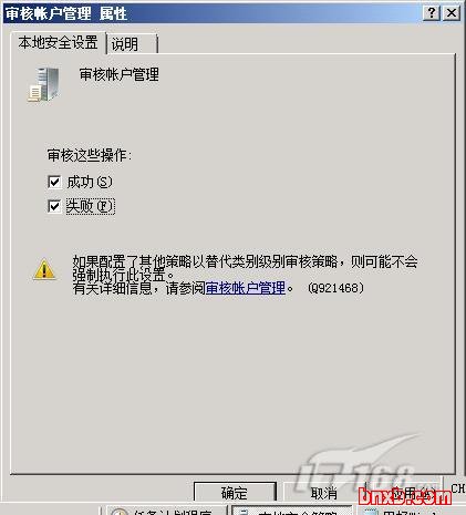 在该列表窗口的左侧显示区域,依次展开“安全策略”/“审核策略”分支选项,在“审核策略”分支下面双击“审核账户管理”选项,打开如图1所示的选项设置对话框,选中“本地安全设置”标签,在对应的标签页面中选中“成功”或“失败”选项,再单击“确定”按钮,如此一来Windows Server 2008系统就会自动跟踪并记录添加或删除用户帐号事件了。