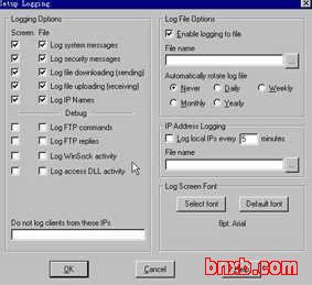 在该窗口的右侧,用户可以选择对不同的事件进行记录,其中包括系统信息,安全信息等,同时用户还可以设置是将所记录 畔⑾允驹赟erv-U 的主窗口内,还是保存到某一指定文件内。出于耗用系统资源和备份信息的需要,建议用户把日志信息保存到指定的文件内。