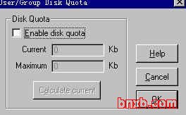 用户可以分别在“FILE”菜单中的“USERS”和“GROUPS”选项的弹出窗口中找到名为“QUATO”的功能按钮。点击之后出现设置窗口,用户可以首先检测某个用户帐号当前所使用的硬盘空间,然后根据具体的情况分别设置不同的用户帐号所能支配的最大硬盘空间,从而有效的解决硬盘空间不足的问题。