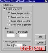 用户可以在“FILE”菜单中的“FTP-SERVER”,“USERS”和“GROUPS”的弹出窗口中找到名为“U/D RATIOS”的功能按钮,点击之后出现设置窗口。用户可以限制每个FTP 站点的使用者每上传一个文件后可以下载的文件数。例如,如果将某个用户的上传和下载比例设置为1/3,那么该用户每上传一个文件,就可以从FTP 站点下载3个文件。