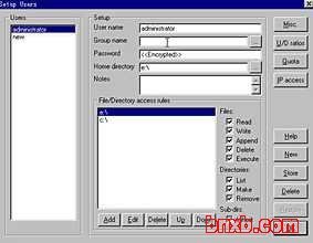 在随后的密码栏中需要输入帐号的口令,如果用户在服务器的设置中选择了加密密码的选项(见前文),那么所输入的密码将自动以加密方式储存。关于密码很重要的一点是只有输入的前8位字符有效,希望能够引起广大Serv-U 使用者的注意。另外,如果用户在建立新的帐号时没有输入相应的密码,那么并不意味着该用户帐号没有密码,Serv-U 将会尝试着寻找是否该用户帐号属于某一个用户组并且该用户组具有统一的密码。如果Serv-U 没有找到相应的用户组密码的话,将会拒绝该用户帐号的访问。如果用户确实希望不规定某个帐号的密码,只要在相应帐号的密码一栏中输入“$#@60;$#@60;None$#@62;$#@62;”即可。上述情况的一个例外是Anonymous 用户帐号,该帐号没有密码,Serv-U 只要求用户输入符合邮件地址格式的任意字符串即可。