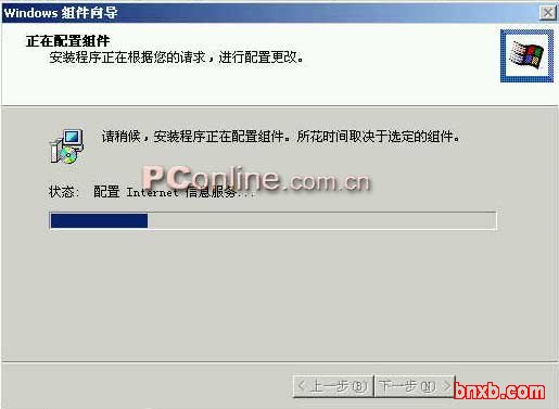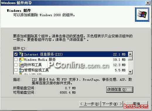 步骤2:选择"配置Windows",单击"组件"按钮,在【Windows组件向导】对话框中,选择【Internet信息服务】组件,单击【详细信息】进行进一步设置,例如FTP服务、SMTP服务、WWW服务通常可以选装。单击【下一步】,从Windows2000安装光盘中拷贝所需文件,安装完毕后如下图2、3、4、5、6所示。