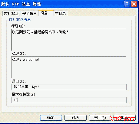 定义用户访问FTP站点和退出站点时的信息以及最大连接数,如图: