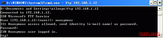 在运行中,打开cmd,然后输入 ftp 192.168.1.12(刚才设置的IP地址)回车,输入用户名anonymous。