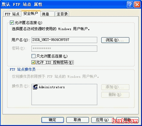 允许匿名连接选项一定要填上。否则用户访问此站点时需要用户名和密码。默认状态下是可以允许匿名访问的。用户名为anonymous,密码为空。
