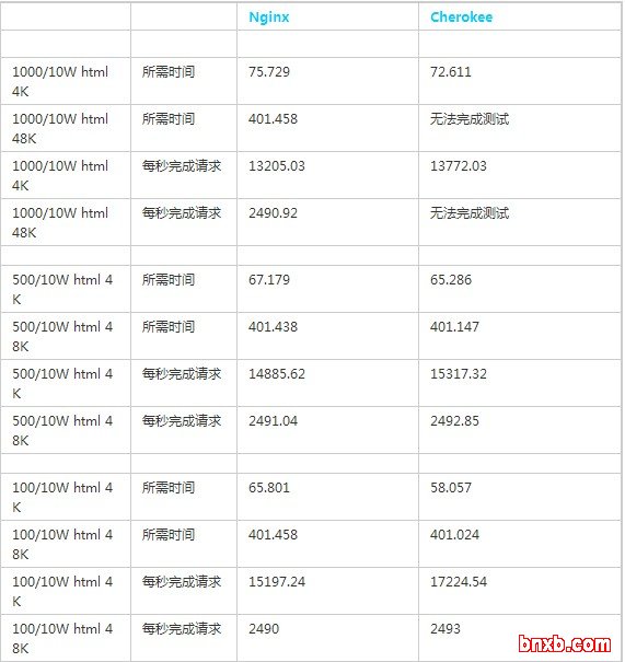 测试得出结果,在 ab 进行 100 个线程压力测试的时候,Cherokee 的完成测试时间要比Nginx少,原因是 Cherokee 每秒所处理的请求数要比 Nginx 多!