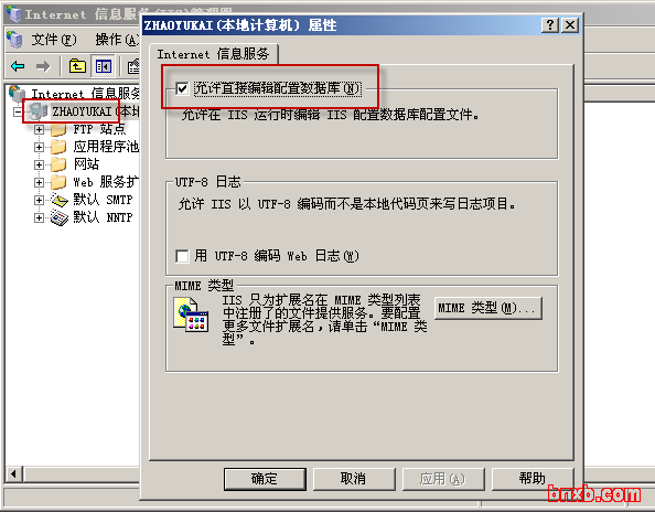 打开IIS,然后打开IIS属性页,勾选上“允许直接编辑配置数据库”选项
