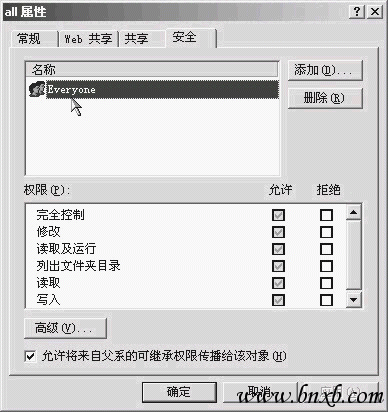 3.你的目标目录被限制了访问权限。此项仅当该目录位于NTFS格式分区中时才可能出现。请在其上单击右键,选“属性”,再进入“安全”窗口,看列表中是不是默认的允许“Everyone”组完全控制的状态,如不是,请改回,如图5。