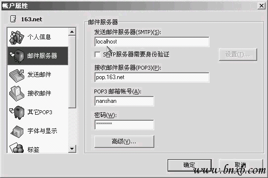 如果你想要用自己的SMTP服务器发信,只需将你E-mail客户端软件设置中“发送邮件服务器(SMTP)”项中填入“localhost”,则不管你的IP地址如何变化,它都能正常工作,如图6 。