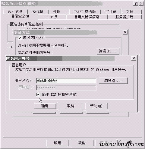 2.没有设置允许匿名访问或作了不应该的改动.如图4所示,首先应确保已勾选中了“匿名访问”这一项;并且其下“编辑”中“匿名用户帐号”中“用户名”一项应为“IUSR_NODISK”(其中“NODISK”为计算机名)的格式;另外,还需要已勾选中“允许IIS控制密码”一项。