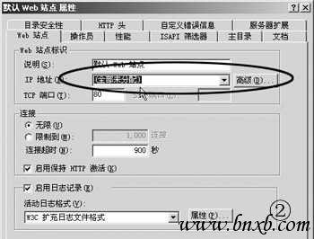 为了使别人能很方便地访问你的网页,首先得设定IP地址,在“默认Web站点属性”中单击“Web站点”标签,就可以输入IP地址了(如图2)。目前安装宽带网的朋友很多,但是拥有固定的IP地址还是很少的,所以在这我们也可以使用其默认的“全部未分配”。但这对于希望能有更多用户来浏览自己网站的朋友来说,还有一种更好的办法把我们动态IP地址转换为固定的域名进行访问。方法有许多,像利用DNS2Go、DynamicHost等都可以实现。