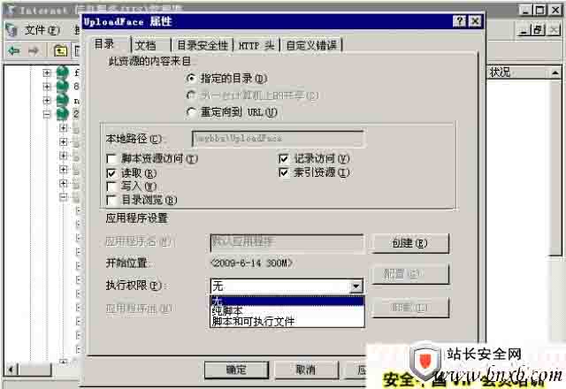 对付上传,我们可以总结为:可以上传的目录不给执行权限,可以执行的目录不给上传权限。Web程序是通过IIS用户运行的,我们只要给IIS用户一个特定的上传目录有写入权限,然后又把这个目录的脚本执行权限去掉,就可以防止入侵者通过上传获得webshell了。配置方法:首先在IIS的web目录中,打开权限选项卡、只给IIS用户读取和列出目录权限,然后进入上传文件保存和存放数据库的目录,给IIS用户加上写入权限,最后在这两个目录的“属性”—“执行权限”选项把“纯脚本”改为“无”即可。见下图