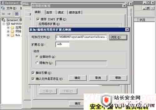 应当说,有一点网络安全的管理员,都会把从网上下载的网站程序的默认数据库路径进行更改。当然也有一部分管理员非常粗心,拿到程序直接在自己的服务器上进行安装,甚至连说明文件都不进行删除,更不要说更改数据库路径了。这样黑客就可以通过直接从源码站点下载网站源程序,然后在本地测试找到默认的数据库,再通过下载数据库读取里面的用户信息和资料(一般是经过MD5加密的)找到管理入口进行登陆获得webshell。还有一种情况是由于程序出错暴出了网站数据库的路径,那么怎么防止这种情况的发生呢?我们可以添加mdb的扩展映射。如下图所示: