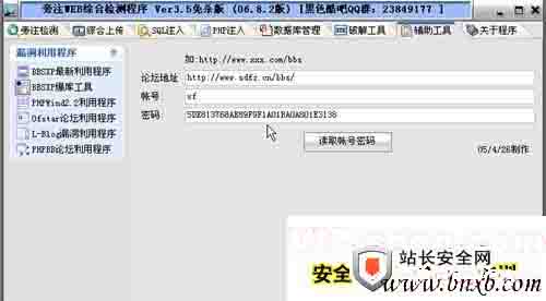 然后将上面记录的Cookies,全部复制并且粘贴到本地的一个空白记事本中。在切入至上方“辅助工具”标签,单击左侧“BBSXP暴库工具”标签,在“论坛地址”标签处,输入刚才注册账号的论坛地址,单击“读取账号密码”按钮,此时便可得到管理员账号和其加密密码(图6)。