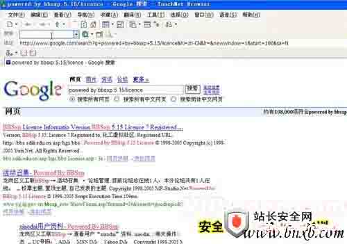 这里以BBSXP论坛为例,首先打开“Google”的官方站点,在其界面内输入“powered by bbsxp 5.15/licence”关键字,单击“搜索”按钮,此时便可搜索出一堆BBSXP论坛5.15版+Access数据库的论坛链接(图1)。