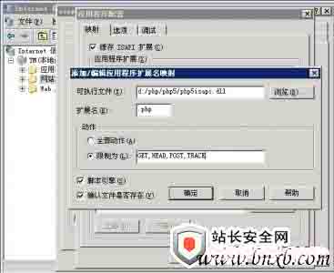 在网站属性里面,主目录选项卡,单击配置——映射在下面应用程序扩展中添加新增加一个映射扩展名如本文的添加.PHP的后缀,可执行文件为的D:/PHP/PHP5/php5isapi.Dll,动作限制为GET,HEAD,POST,TRACE如图: