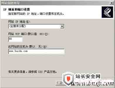 输入好了以后单击下一步,如果你是用多IP的方法建立虚拟主机,就选取你要用在这个网站上的IP,(我相信这个没有谁会这么做吧)输入主机头,既是你这个网站所要用域名。如图