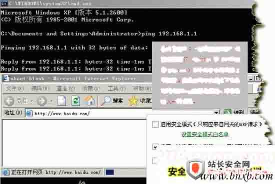 好了,开始攻击后,我的电脑风云防火墙未选中“启用主动防御”功能,结果如下:先 Ping 网关,是通的,打开一个网站试一下,baidu.com 一直打不开。晕了,攻击成功了。如下图: