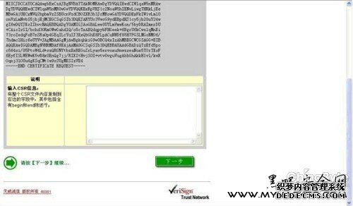 接下来就会出现一个如图4所示的提交证书请求文件界面。此时,我们先用记事本打开前面已经生成的证书请求文件,在本文中就是“c:\ resin-pro-3.2.1\key\myevssl.csr”文件。然后将其中所有的内容全部复制到证书请求文件提交界面中的文本框中。完成后单击“下一步”按钮继续其注册过程。